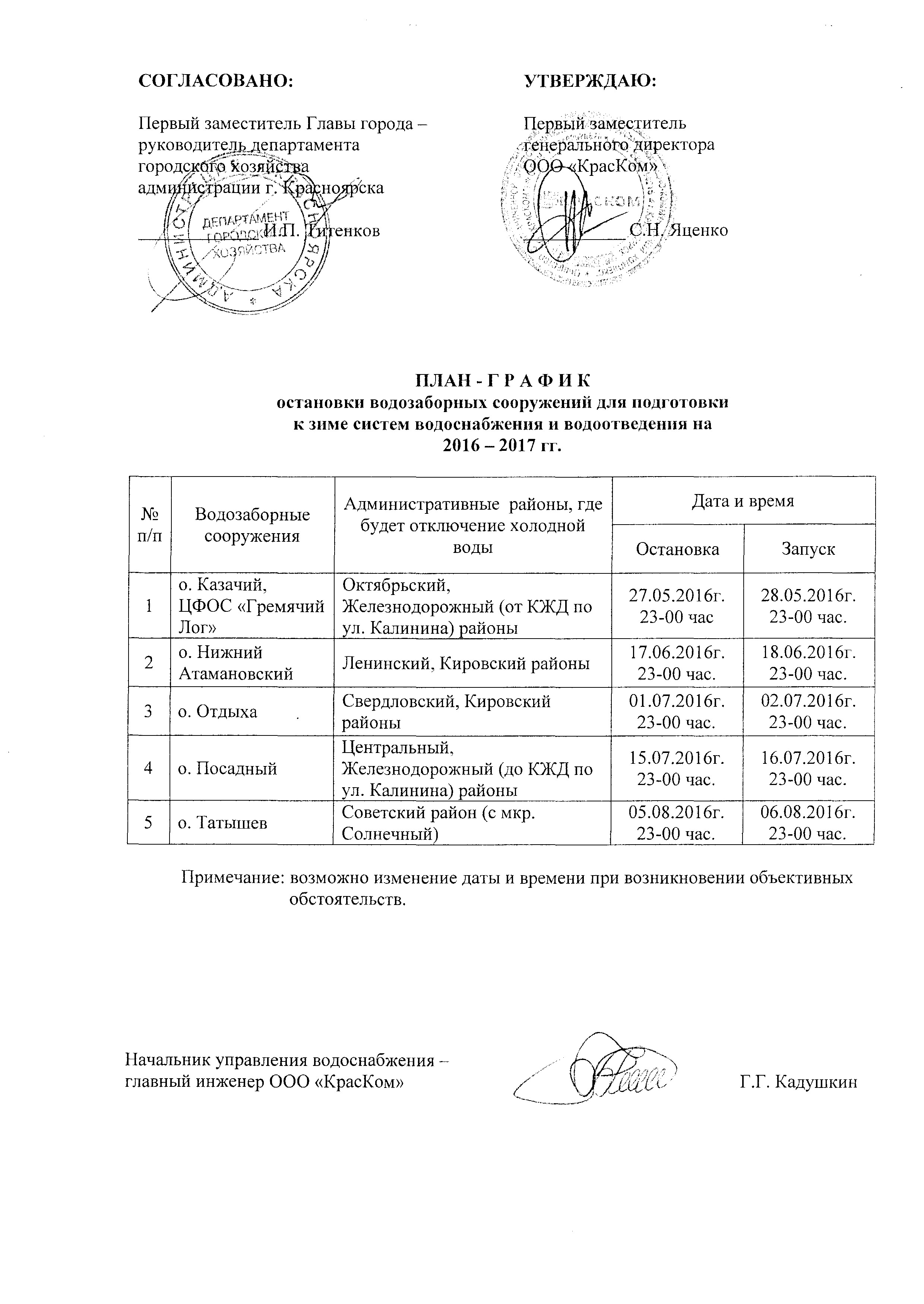 ГРАФИК ОСТАНОВОК ВОДОЗАБОРОВ НА 2016 ГОД