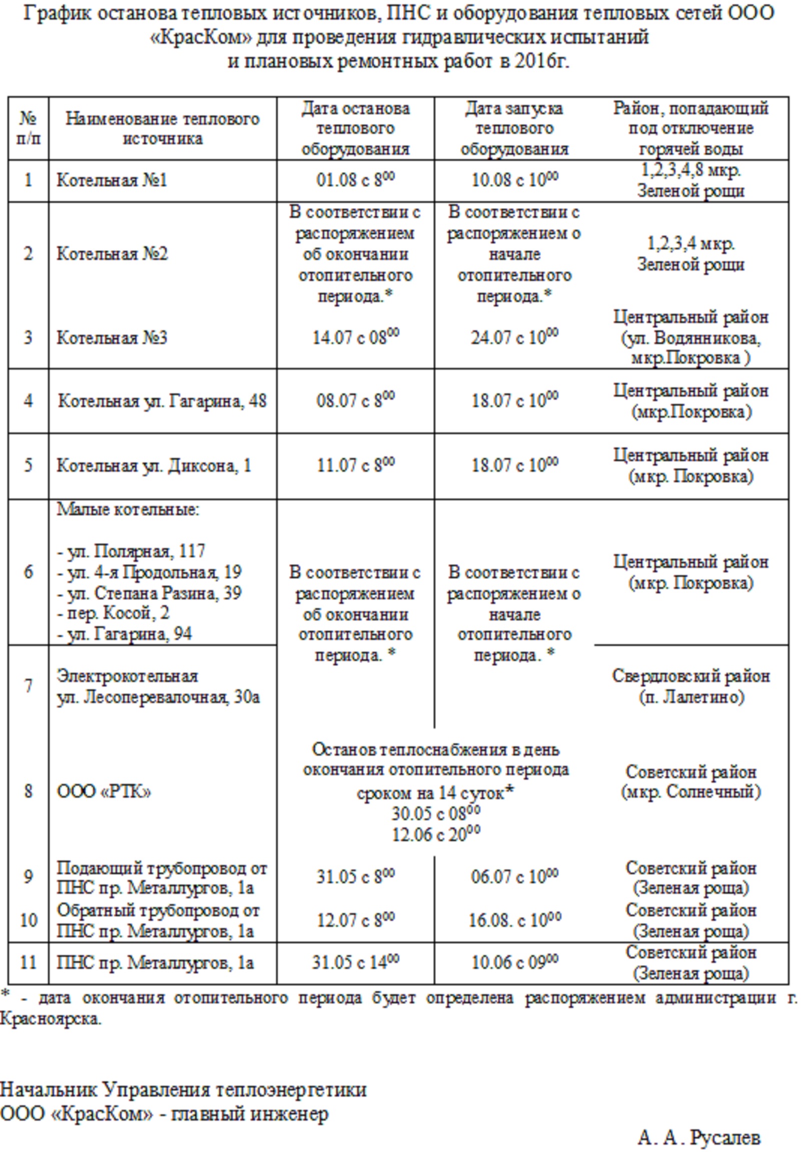 ГРАФИК ОСТАНОВОВ КОТЕЛЬНЫХ "КРАСКОМ" НА 2016 ГОД