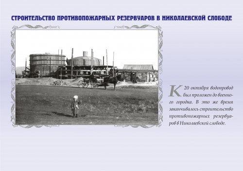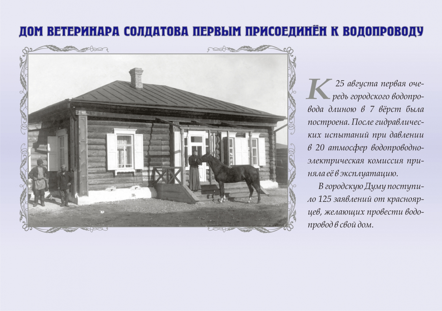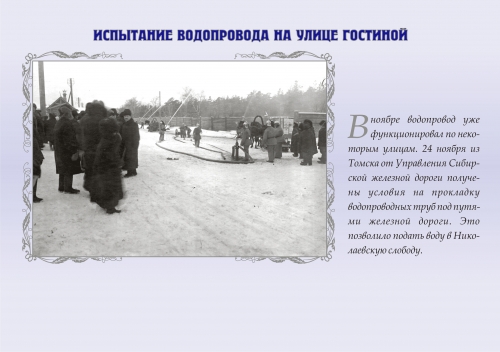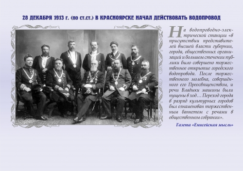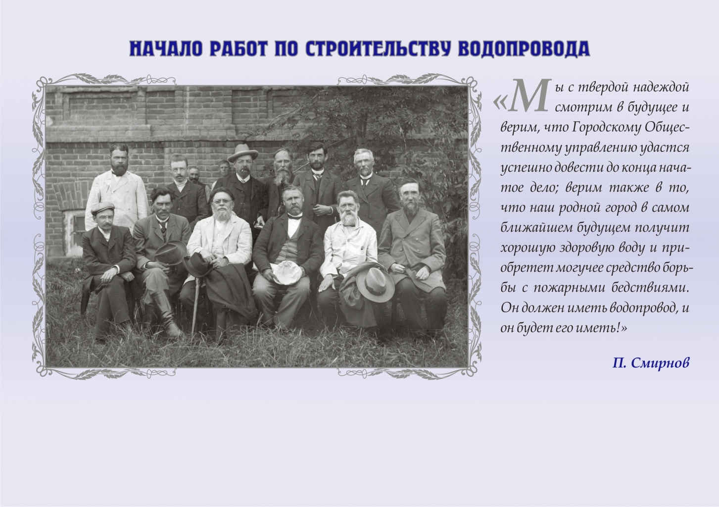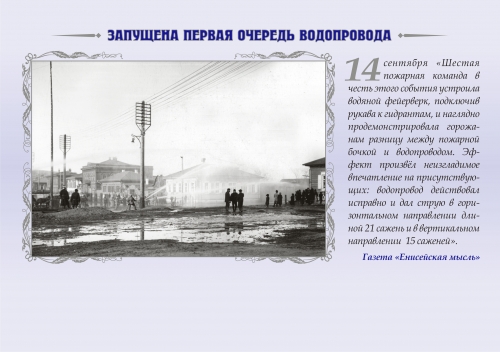 Водопровод был опробован 14 сентября 1913 года. Пожарная дружина вольно - пожарного общества, подключив рукава к гидрантам, устроила показательный водяной фейерверк на радость собравшихся горожан. На воду был установлен тариф – 25 копеек за 100 ведер.