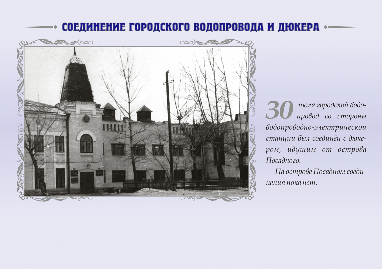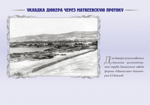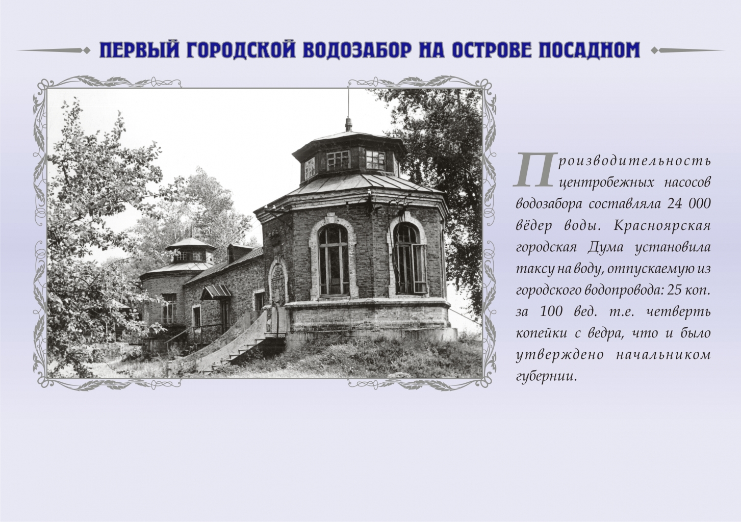 Дюкер через протоку Енисея, соединяющий водозабор с городским водопроводом, был выполнен из стальных цельнотянутых труб диаметром 12 дюймов (дюйм равен 2,54 см) фирмы «Маннесман», выдерживающих давление в 50 атмосфер.