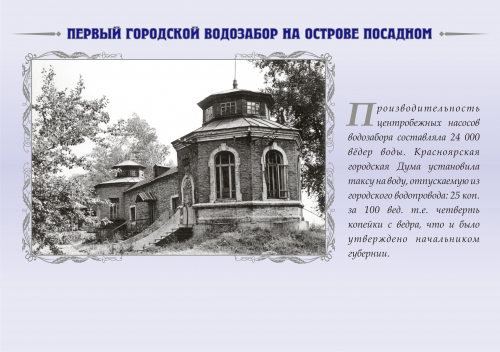 К строительству первой очереди сооружений красноярского водопровода приступили вскоре же после выпуска займа. Водопроводно-электрическую станцию возвели на берегу Енисея напротив острова Посадный. Одновременно на острове Посадный сооружался шахтный водозаборный колодец инфильтрационного типа.
