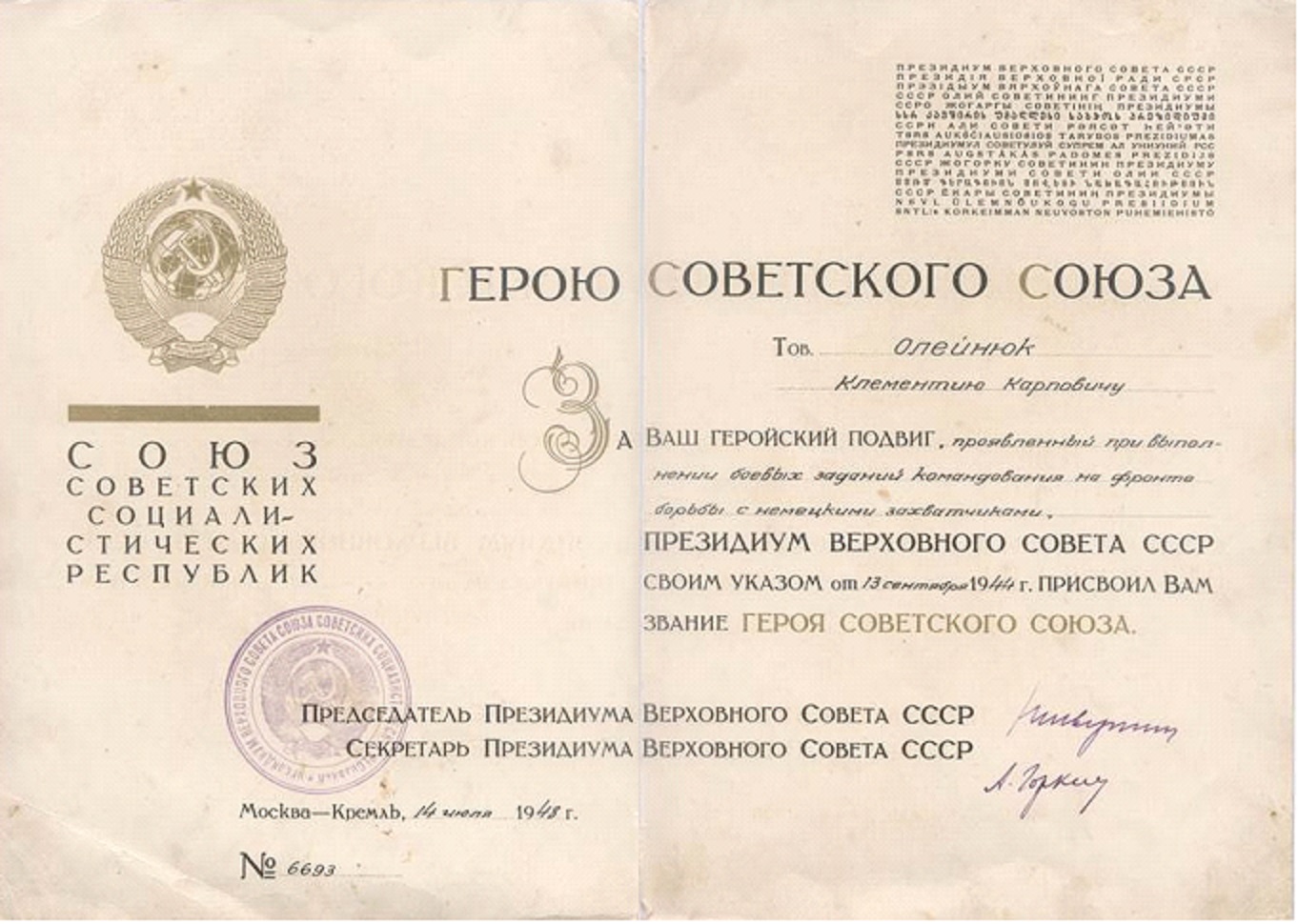 - Олейнюку Климентию Карповичу за подвиг в Великой Отечественной войне присвоено звание Героя Советского Союза.
