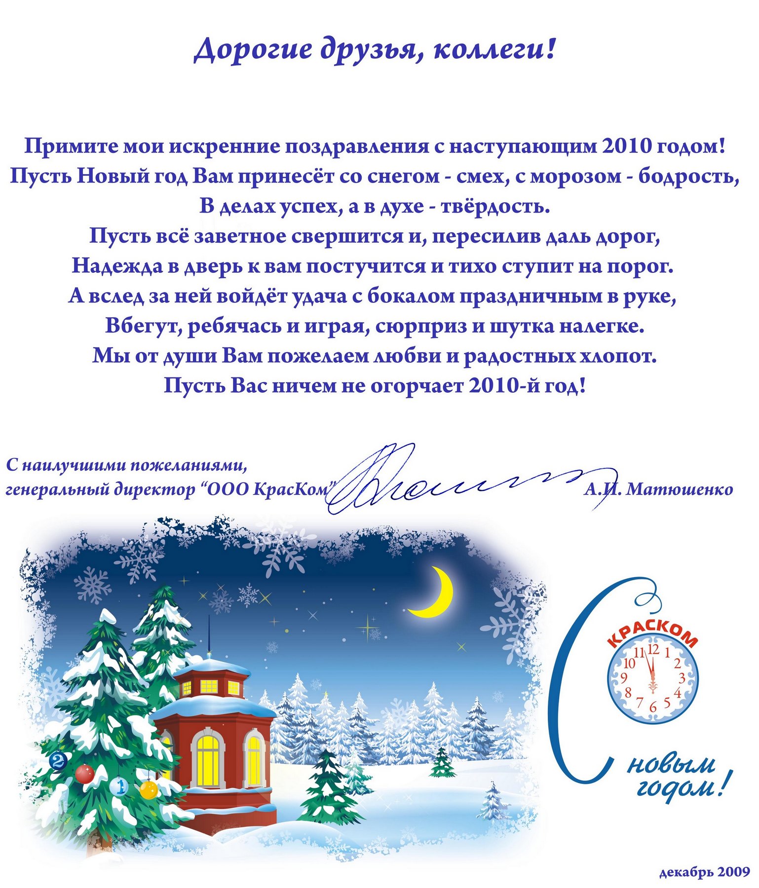 Уходящий год запомниться работникам «Красноярского жилищно-коммунального комплекса» ожиданием глубочайшего финансового кризиса во всей экономике России, и как, следствие, резким падением платежеспособности потребителей наших услуг. Тем не менее, не смотря на кризис, предприятию удалось выполнить все намеченные производственные программы по капитальному ремонту и модернизации объектов жизнеобеспечения. Устойчивое финансовое состояние позволило «КрасКому» своевременно выплачивать заработную плату и не нарастить к концу года кредиторской задолженности. От 2010 года мы ждём экономического роста для наших предприятий-партнеров и потребителей наших услуг. Надеемся получить средства из федерального бюджета на модернизацию основных производственных мощностей систем водоснабжения и водоотведения Красноярска, предзащита проектов в Министерстве ЖКХ уже состоялась. Это позволит «КрасКому» и дальше подавать красноярцам чистую енисейскую воду. Весь коллектив «Красноярского жилищно-коммунального комплекса» поздравляет вас, уважаемые жители нашего города с наступающим Новым годом и дарит вам свой труд и умение, для вашего комфорта и благополучия.