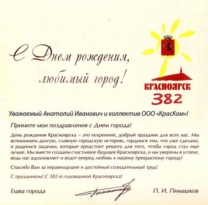 Глава города Красноярска Петр Пимашков поздравил коллектив компании "КрасКом" с Днем города.