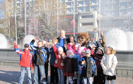 После торжественного запуска и экскурсии ребятишки получили от компании «КрасКом» памятные подарки, а в завершении был сделан памятный снимок на фоне работающего фонта с Петром Пимашковым.
