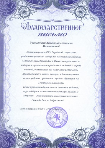 Компания «КрасКом» получила благодарность Администрации МКУ Городской социально-реабилитационный центр для несовершеннолетних «Забота» за организацию праздника.