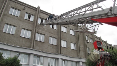 16 час. 10 мин. К зданию управления прибыли профессиональные пожарные ПЧ-1 ГУ «ОФПС-30». Была развернута автомобильная механическая пожарная лестница. Четыре сотрудника были эвакуированы по автолестнице с 3-го этажа и два сотрудника по веревочным тралеям.