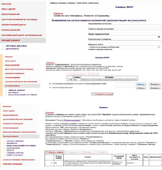 Как отметил начальник управления информационных технологий компании Юрий Батраков, в настоящее время эта функция сайта предназначена только для юридических лиц. Тем не менее, через регистрацию на сайте любой желающий может подать заявку на услуги «КрасКома»: выдачу технических условий, оформление акта раздела границ, согласование проекта и т.п. Для этого необходимо выбрать услугу, заполнить форму «Заявки», прикрепить сканированные документы и отправить заявку. Информация об изменениях статуса «Заявки», например, когда она принята в работу или уже выполнена, автоматически приходит заявителю на электронную почту.