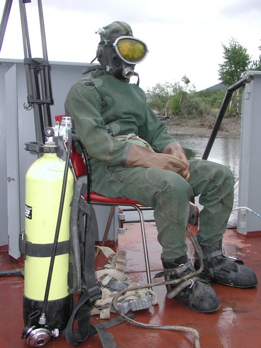 Круглый год водолазам «КрасКома приходится работать в постоянно холодной и мутной воде сильного течения р. Енисей, дно которого в районе города покрыт зарослями водорослей, а берега кустарником. В таких сложных условиях специалисты участка подводно-восстановительных работ осматривают подводные коммуникации, определяют степень заноса труб донными отложениями либо вымывания грунта из-под дюкеров, в результате чего водовод оказывается без опоры, деформируется и может переломиться.