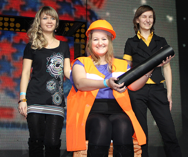 На фото: Коронация Лучшего молодого специалиста 2012 г. со всей соответствующей атрибутикой: трон, корона, мантия, скипетр и свита Её Краскомовского Величества.