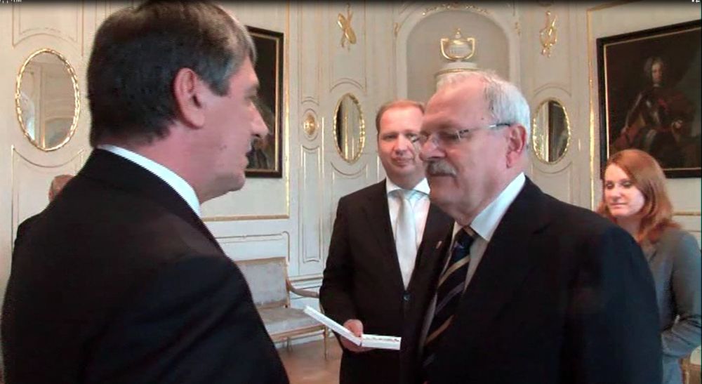 На фото: Президент Словацкой Республики Иван Гашпарович вручает награду члену Совета директоров ООО «КрасКом» Валерию Грачеву.