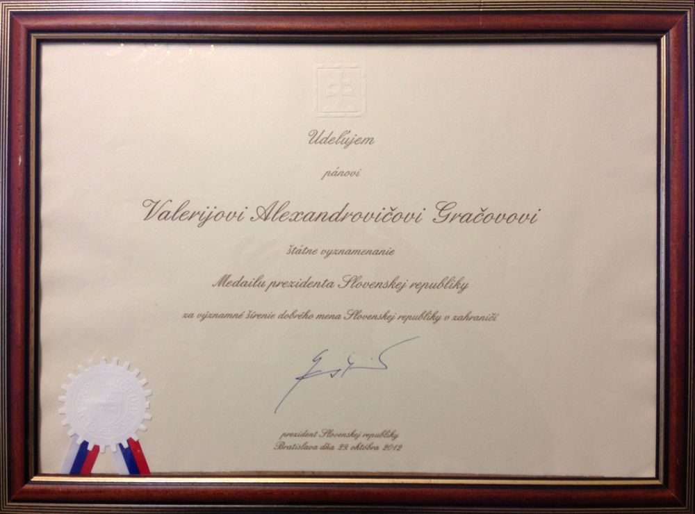 За особый вклад в сотрудничество между Словацкой Республикой и зарубежными странами член Совета директоров «Красноярского жилищно-коммунального комплекса» Валерий Грачев награжден медалью Президента Словацкой Республики».