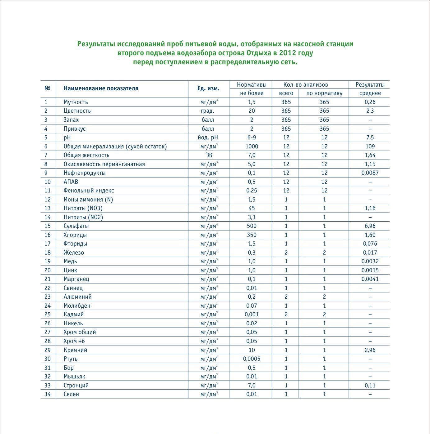 На таблице: Результаты исследований проб питьевой воды, отобранных на насосной станции второго подъема водозабора острова Отдыха в 2012 году перед поступлением в распределительную сеть