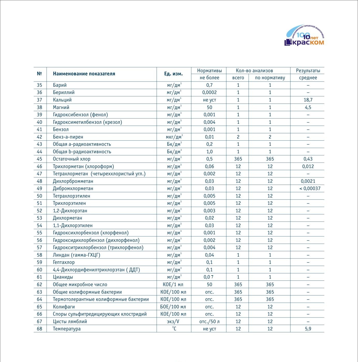 Кроме того, лабораторные исследования подтвердили её соответствие нормативам органолептических показателей: цветность, запах, привкус, мутность. Значительно ниже допустимых уровней такие показатели как жесткость и окисляемость перманганатная. Содержание в питьевой воде всех остальных органических и неорганических веществ также на порядок ниже нормативных значений санитарных правил.