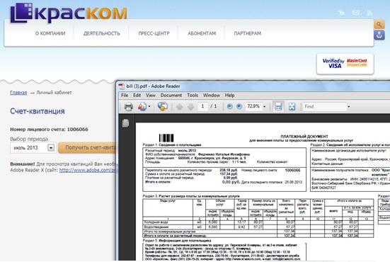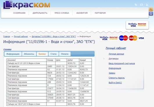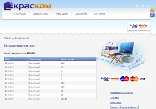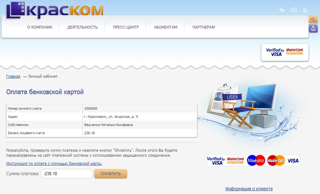 Наталья Волкова. Ведущий инженер службы IT ООО «КрасКом». В личном кабинете теперь есть возможность получить копии счетов-фактур для юридических лиц и оплатить услуги "КрасКома" банковскими картами "Виза" и "Мастер кард". Также эта услуга доступна для жителей частного сектора, абонентов "КрасКома", физических лиц. Они также могут за любой выбранный период распечатать квитанцию и оплатить из своего личного кабинета услуги по холодной воде банковскими картами.
