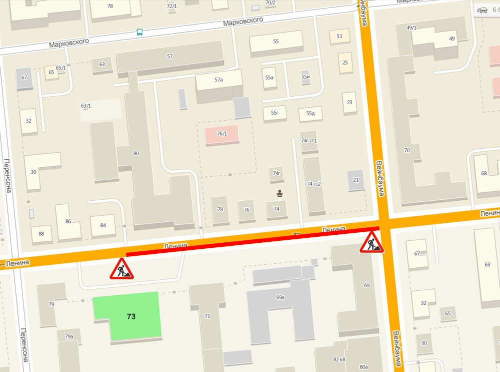В рамках подготовки к новому отопительному сезону на этом участке проведут капитальный ремонт тепловых сетей. Для обеспечения безопасности ремонтных работ будут перекрыты две полосы движения по нечетной стороне улицы Ленина.