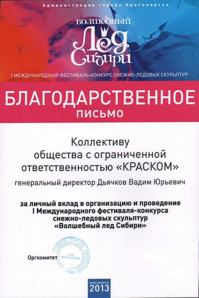 За личный вклад в организацию и проведение праздничного мероприятия компания «КрасКом» удостоилась благодарственного письма от Управления культуры администрации города.