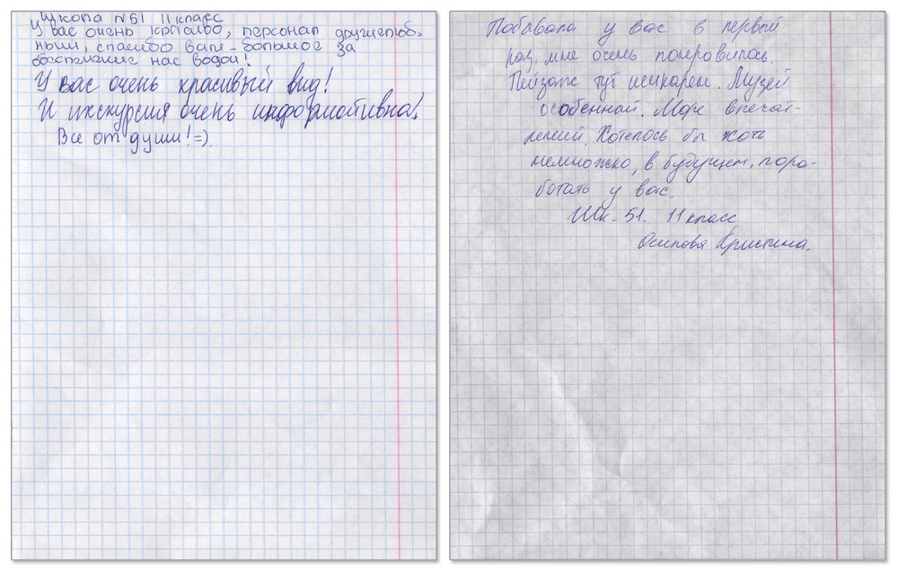 По окончании встречи ученики поделились впечатлениями. Эти комментарии, написанные на тетрадных листках, станут первыми в книге отзывов музея водопровода.