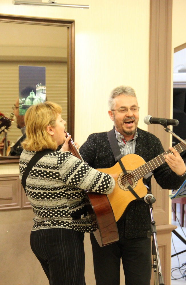 Для виновников торжества работники «КрасКома» совместно с представителями красноярского клуба бардовской песни подготовили концерт, большинство номеров которого были на военную тематику.