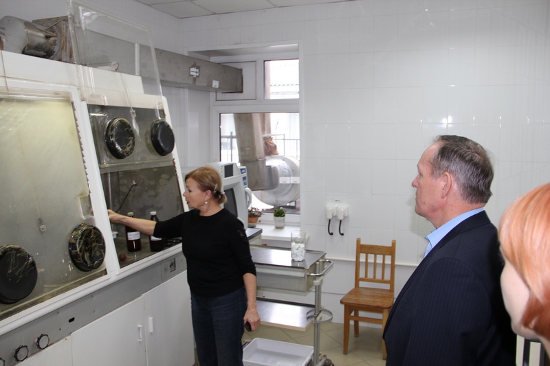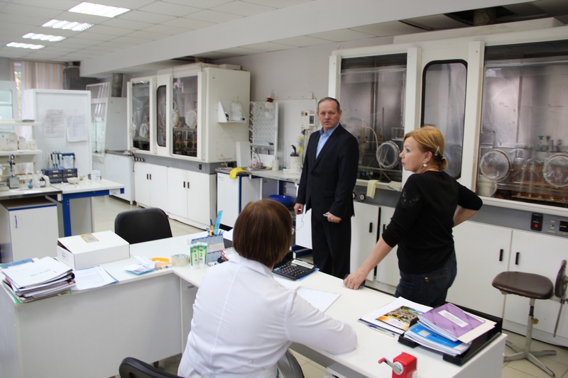 Начальник ЦККВ Ольга Миронова демонстрирует членам комиссии организацию работы лаборантов с реагентами, кислотами и щелочами.
