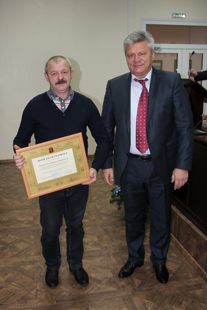 Кроме того, Благодарственным письмом Законодательного собрания Красноярского края награжден начальник участка объединенных котельных Юрий Вязиков. Почетная грамота Администрации г. Красноярска была вручена кочегару Константину Крачуну.