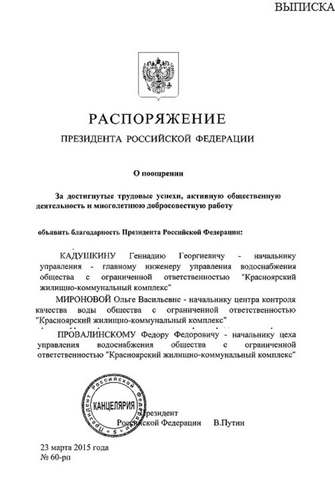 ПРОВАЛИНСКОМУ Федору Федоровичу - начальнику цеха управления водоснабжения ООО "Красноярский жилищно-коммунальный комплекс".