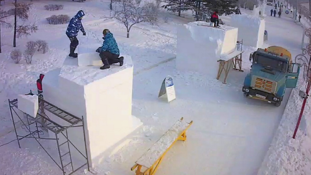 За работой команд можно наблюдать с помощью онлайн-трансляции на сайте администрации города. В объектив видеокамеры зачастую попадают и автоцистерны компании «КрасКом», которые продолжают подвозить холодную воду - один из инструментов для монтажа и оформления скульптурных шедевров из снега и ледяных кристаллов.