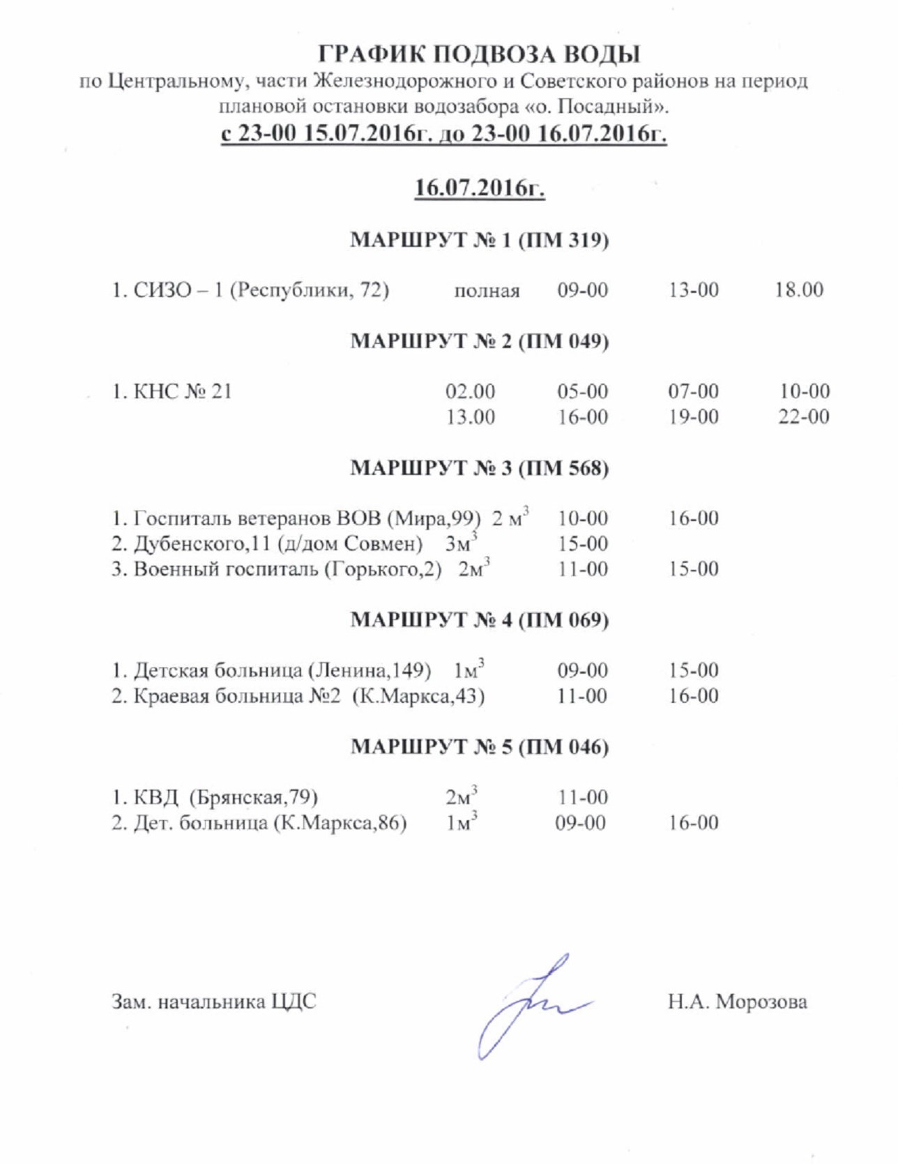 Жителям Центрального района и части Железнодорожного (от центра до железной дороги, ул. Маерчака до ул. Северная) и части Советского ( ул. Шахтёров до ул. Березина, ул. Спандаряна, ул. Дудинская, ул. Дубенского, 6 и 8, ул. П. Железняка, 2-б, 2-г, 4-б, 4-г, 6-а, 8, 10/2, 10/4) рекомендуется сделать необходимый запас питьевой воды.