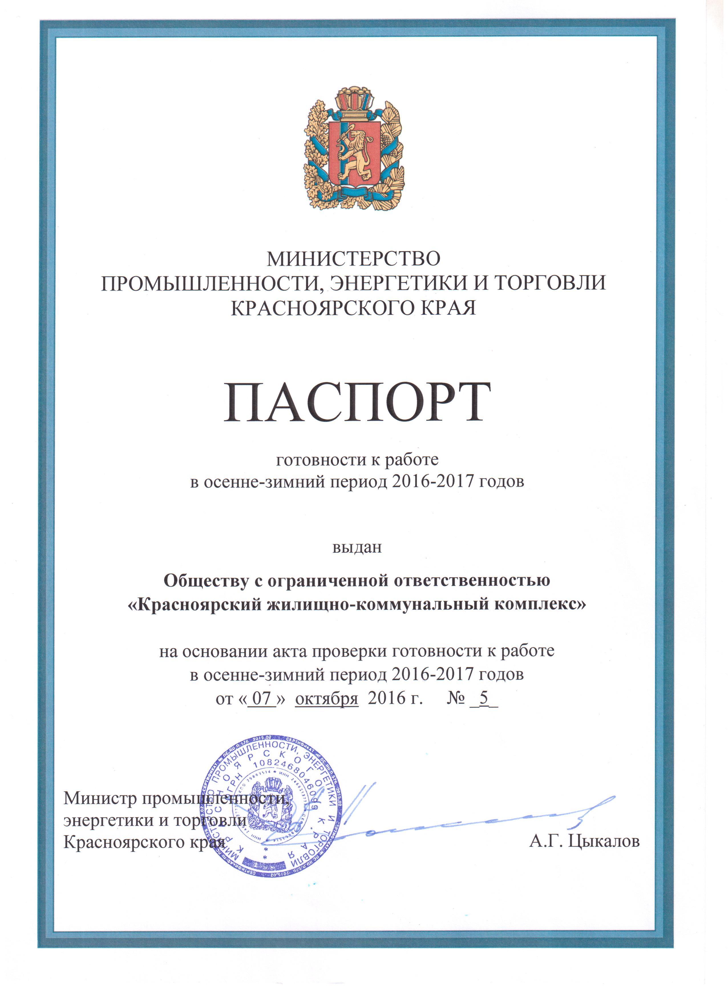 Управление электроэнергетики компании «КрасКом» получило Паспорт готовности к работе в осенне-зимний период 2016/2017 годов.