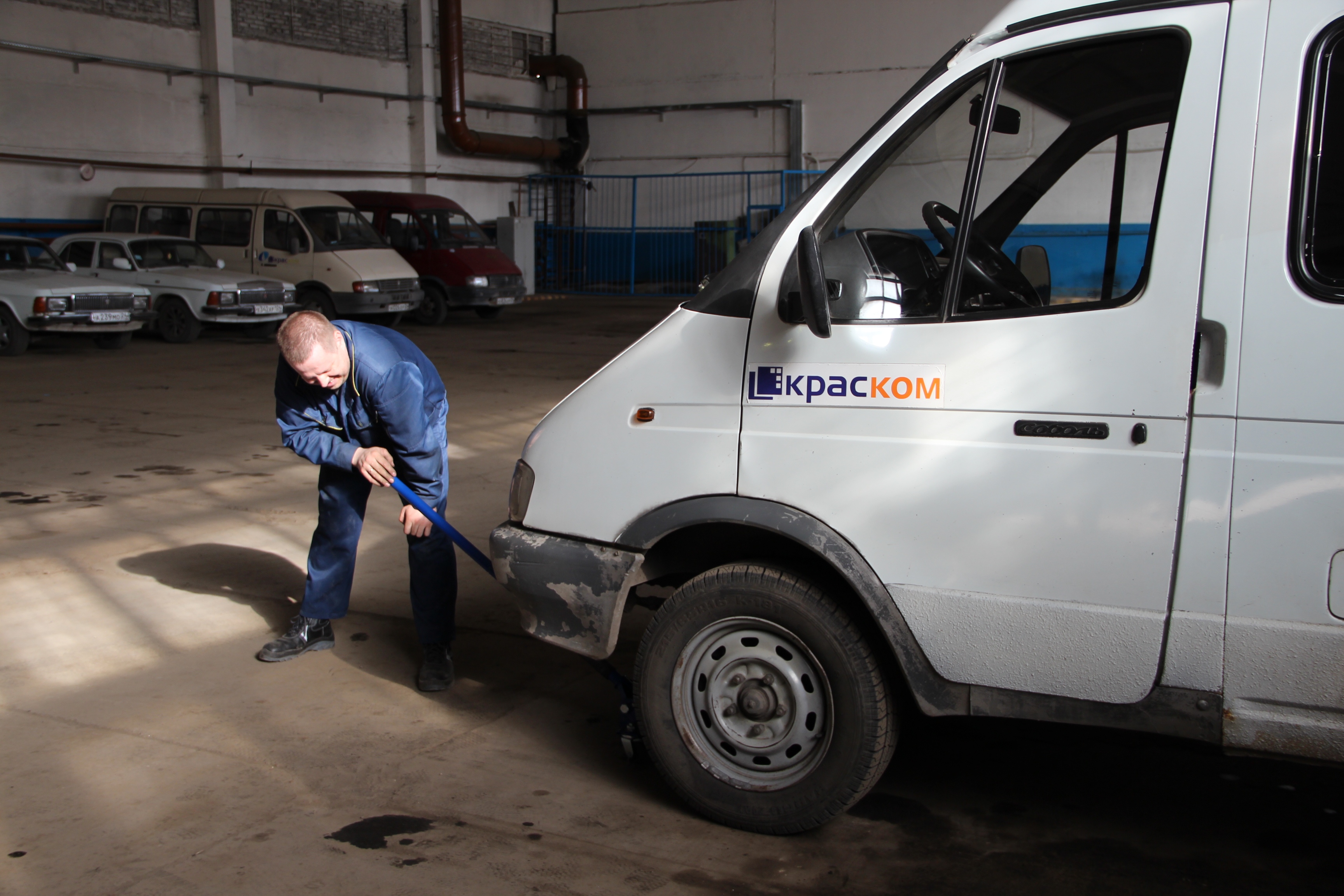 Автотранспортный цех компании «КрасКома» один из самых крупных в городе. Его автопарк насчитывает 260 единиц техники от легковых автомобилей до специализированных коммунальных машин, многофункциональной и автотракторной техники. Раньше чтобы подготовить колесную технику сначала к лету, а затем к зиме «КрасКом» ежегодно тратил до полумиллиона рублей, оплачивая услуги по замене резины в сторонних автомастерских.