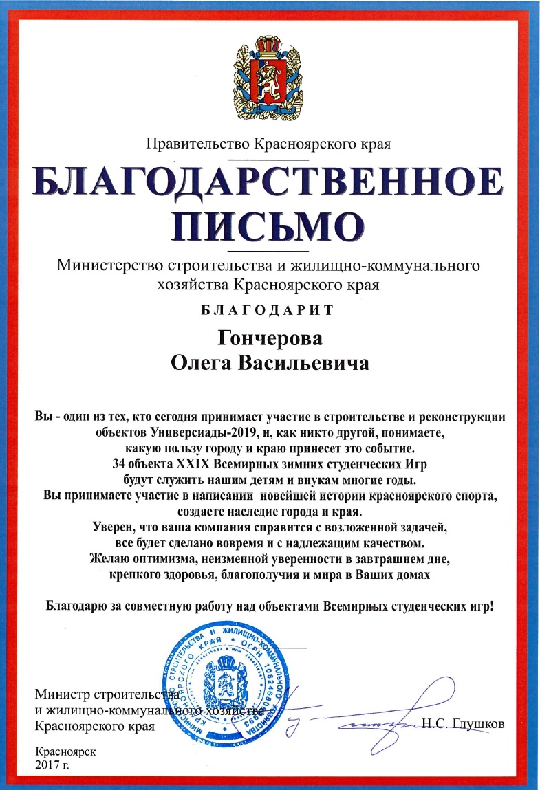 Компании «КрасКом» объявлена благодарность за вклад в строительство инженерной инфраструктуры к объектам Всемирных студенческих игр