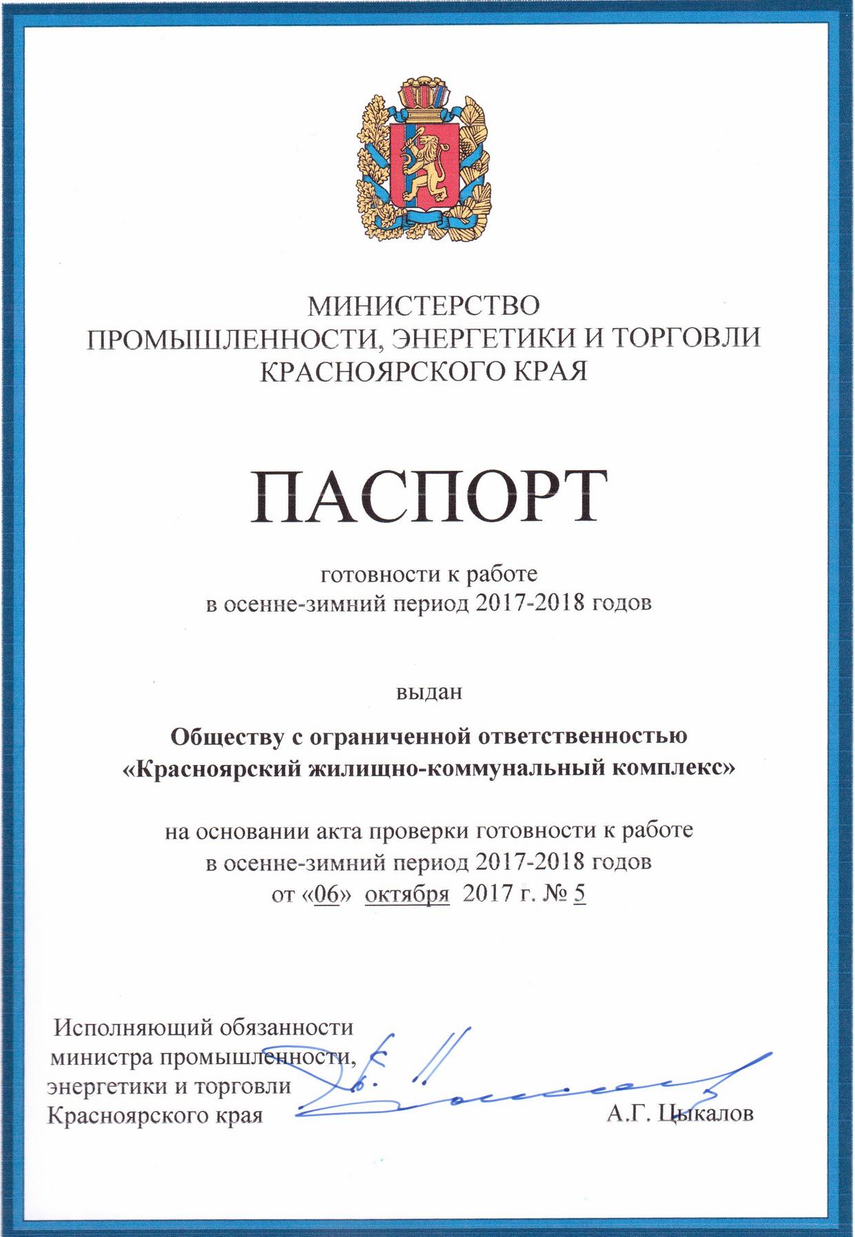 Управление электроэнергетики компании «КрасКом» получило паспорт готовности к работе в осенне-зимний период 2017/2018 годов.