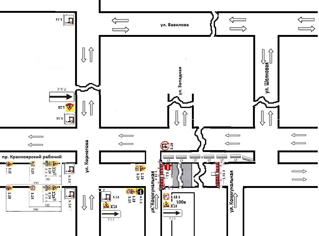 Объезд легкового и грузового транспорта будет осуществляться по улицам Корнетова — Вавилова — Шелковая и далее с выездом на проспект. Водителям рекомендуется учесть данную информацию при выборе маршрута и следить за дорожными знаками на этом участке пр. «Красноярский рабочий».
