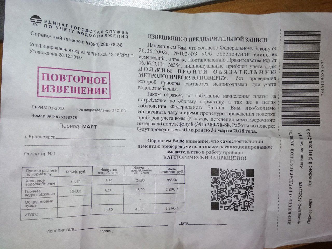 Красноярцы вновь получили фиктивные извещения от некой «Единой городской службы по учету водоснабжения» с требованием срочно провести коллективную поверку счетчиков воды. За разъяснениями горожане стали массово обращаться компанию «КрасКом», имеющую официальный статус гарантирующего поставщика холодного водоснабжения в Красноярске.