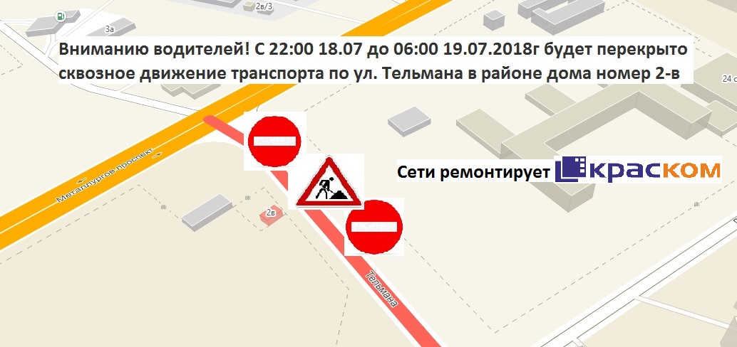 Сегодня, 18 июля с 10 часов вечера до 6 часов утра 19 июля для ремонта сетей водоснабжения будет перекрыт сквозной проезд транспорта по ул. Тельмана в районе дома номер 2-в.
