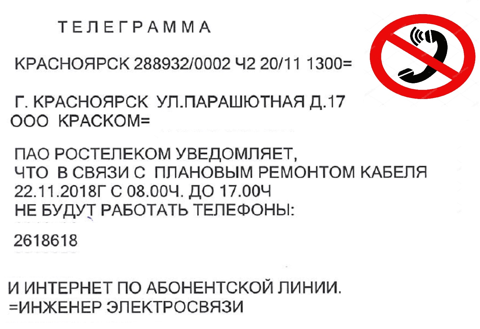 Вниманию красноярцев: 22 ноября Ростелеком отключит на ремонт телефон диспетчерской службы Цеха сетей канализации