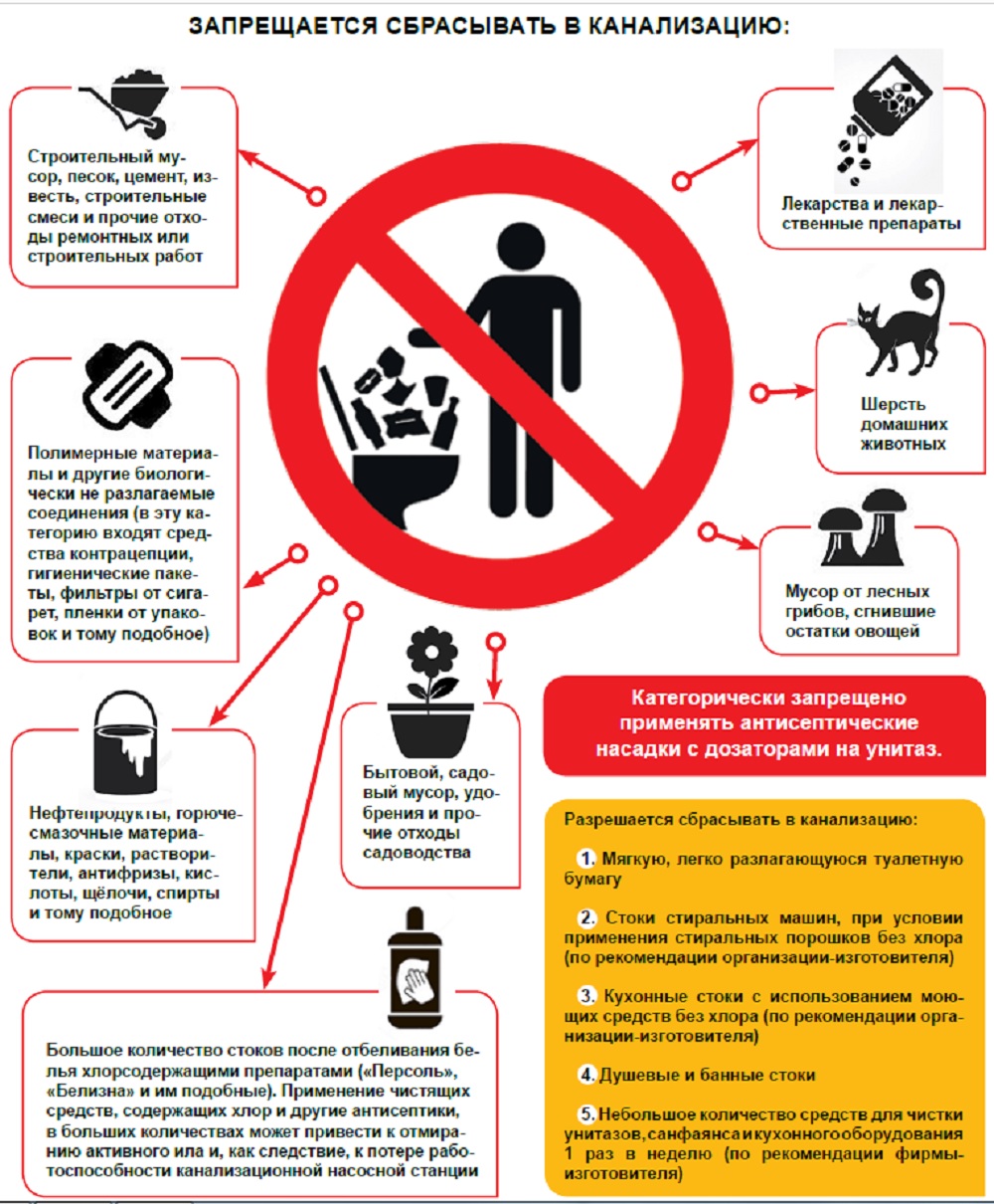 Однако наибольший удар новогодних каникул традиционно придется на сети водоотведения и канализационно-насосные станции. К сожалению, зачастую жители используют унитаз вместо мусорного ведра, и в городскую канализацию попадают категорически запрещенные предметы: остатки салатов и другой еды с новогоднего стола, средства личной гигиены, полотенца и прочие текстильные изделия домашнего обихода. Неправильная эксплуатация внутридомовых систем водоотведения неизбежно ведет к засорам уличных сетей и выходу стоков на дворовую территорию или проезжую часть. Избежать этого возможно, если сливать в канализацию только жидкие бытовые отходы.