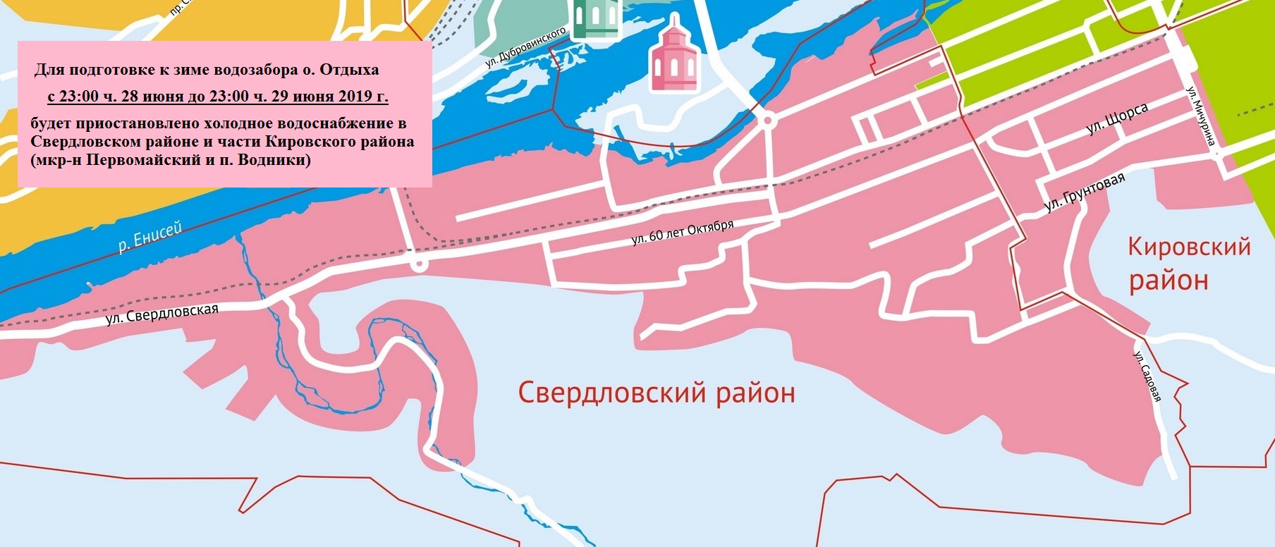 — Холодное водоснабжение в этих районах будет приостановлено в 23:00 часа 28 июня, - рассказывает главный инженер компании «КрасКом» Геннадий Кадушкин. — Напомню, что согласно согласованному с администрацией города графику подачу холодной воды планировалось возобновить через два дня в 23:00 ч. 30 июня. Однако, благодаря большой подготовительной работе, которая в этом году шла в «КрасКоме» с февраля месяца, удалось сократить срок отключения холодной воды в два раза. Насосное оборудование водозабора острова Отдыха мы запустим через одни сутки 29 июня в 23:00 часа.
