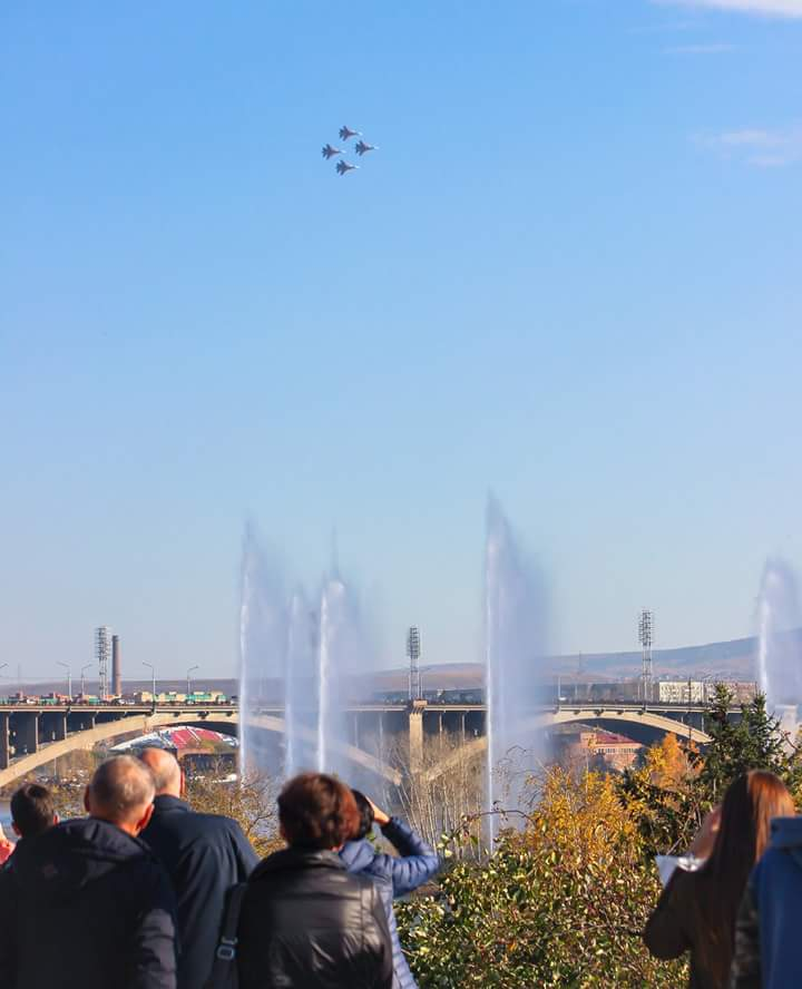 Речной фонтан #КрасКом поприветствует пилотажную группу «Соколы России» брызгами енисейской воды