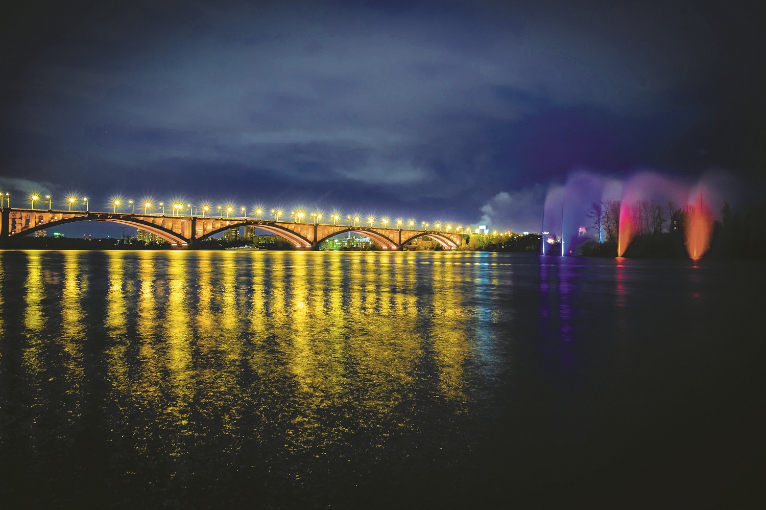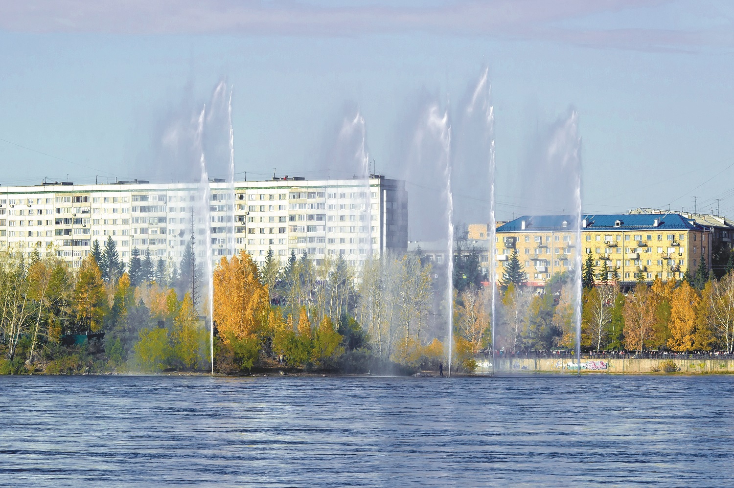 Напомним, что впервые фонтаны из Енисея забили в сентябре 2003 года к 90-летию красноярского водопровода. Однако, проработали они всего один год. В 2018 году к 105-ой годовщине системы питьевого водоснабжения Красноярска сотрудники компании «КрасКом» восстановили гидротехническое сооружение. Высота каждого водяного столба превышает 50 метров. Водная картина речного фонтана подсвечивается в цвета российского флага, составляя единое целое с освещением Коммунального моста. В этом году сезон работы краскомовского фонтана начался 2 марта в день открытия Всемирной зимней универсиады-2019.