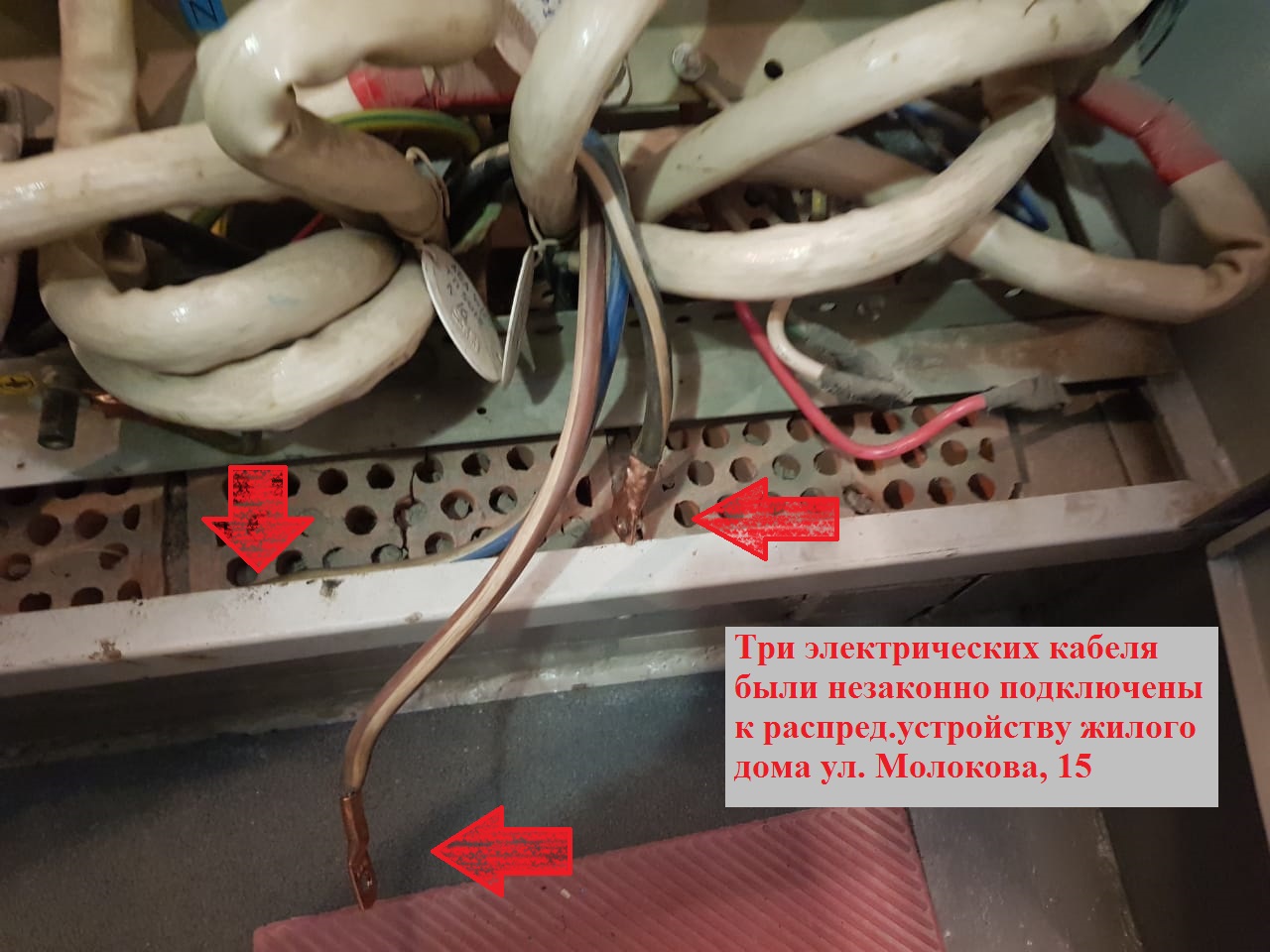 Напомним, что 18 октября в доме на ул. Молокова, 15 сотрудниками компании «КрасКом» в присутствии председателя ТСЖ «Соседи», а также двух свидетелей был заактирован факт самовольного подключения трех кабельных линий к распределительному устройству, расположенному на первом этаже. От этих проводов было запитано не относящееся к управлению дома оборудование, например, для самогоноварения, принадлежащее родственникам председателя ТСЖ «Соседи» и установленное в нежилом помещении данного товарищества.