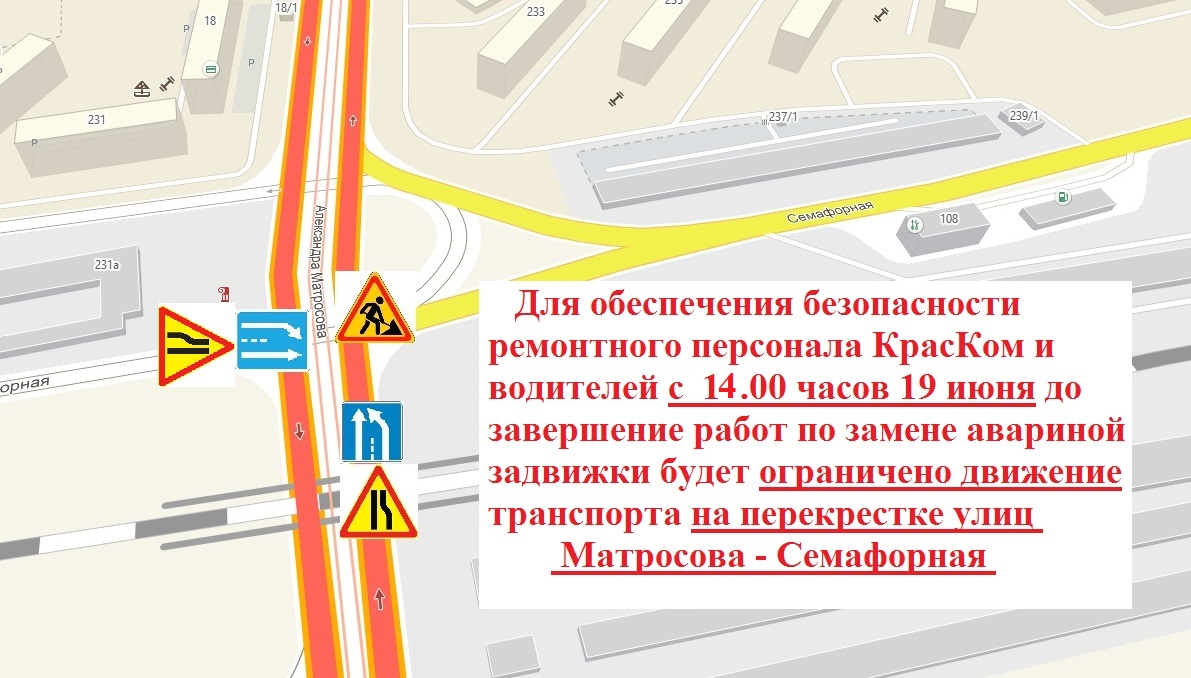 Для обеспечения безопасности ремонтного персонала «КрасКома» и участников дорожного движения с 14.00 часов 19-го июня и до завершения работ будут перекрыты по одной полосе на перекрестке улиц Матросова-Семафорная.