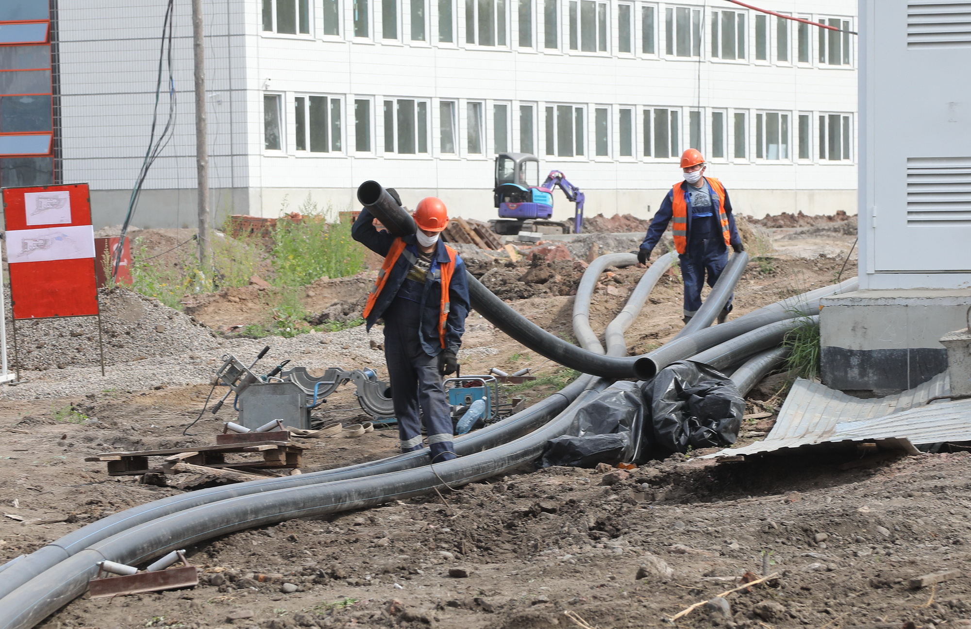 Для подключения школы к городским коммуникациям СГК и КрасКом строят новые трубопроводы для холодной и горячей воды, отопления и канализации.
