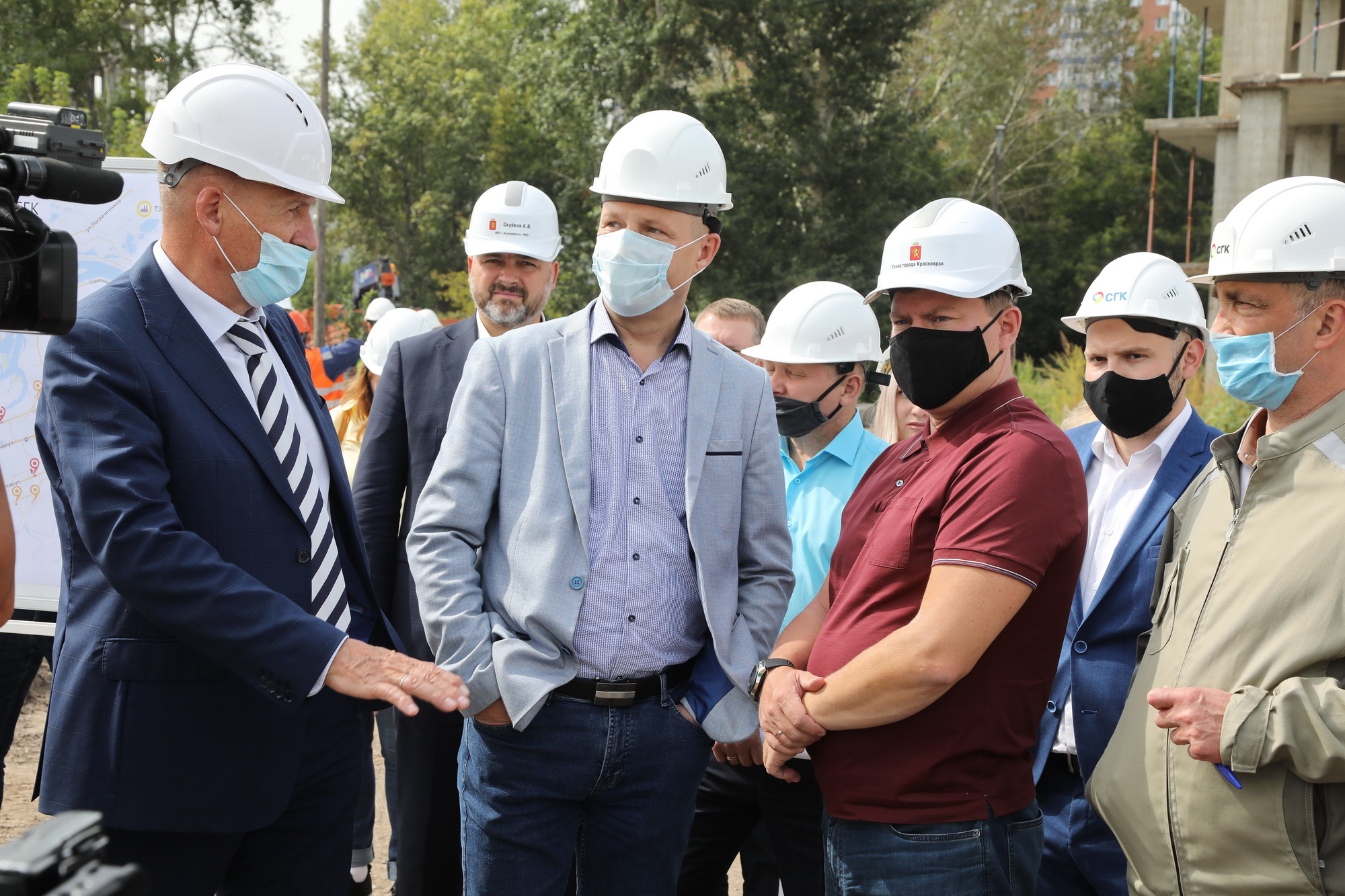 Директор теплотранспортного подразделения СГК Сергей Иванов и генеральный директор компании «КрасКом» Олег Гончеров рассказали главе города Красноярска Сергею Ерёмину, как идут работы по подготовке к новому отопительному сезону системы жизнеобеспечения города на примере строящейся в мкр. Пашенной школы и участка перекладки теплосети на пр. Красноярский рабочий в сквере ДК 1 мая.