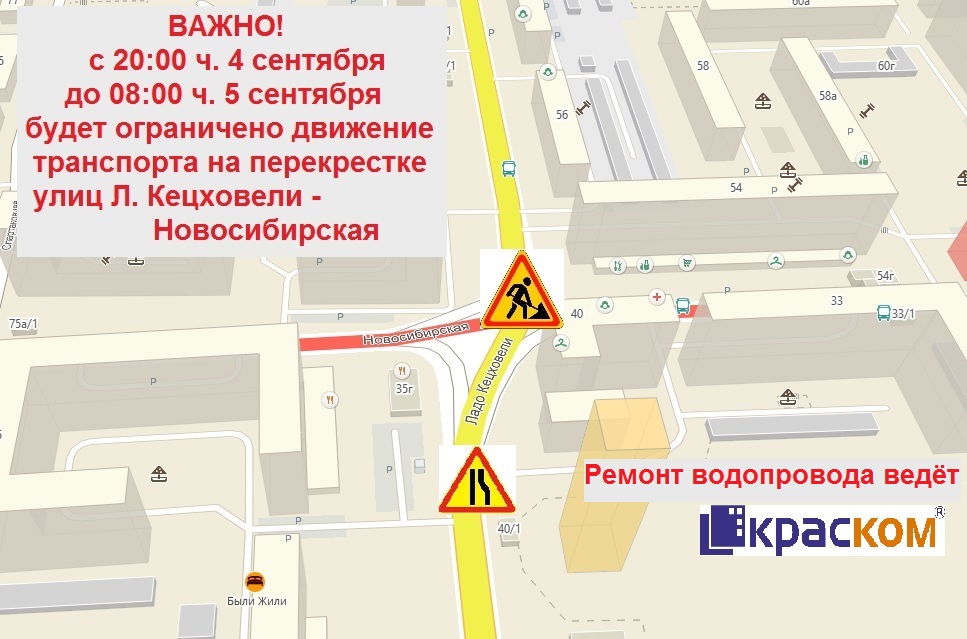 На время земляных работ с 20:00 часов 4-го сентября до 08:00 часов 5-го сентября будет ограничено движение транспорта на перекрестке улице Ладо Кецховели – Новосибирская.