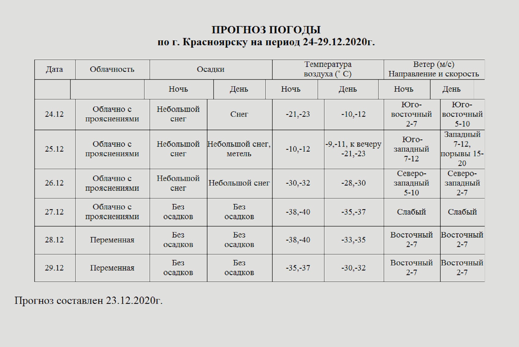 По прогнозу Среднесибирского гидрометцентра ледяной воздух с Арктики будет поступать в наш город вплоть до середины первой недели 2021 года. Кроме того, в отдельные дни синоптики прогнозируют резкие перепады дневных и ночных температур. «Погодные качели» станут очередным испытанием на прочность подземных трубопроводов водоснабжения и водоотведения из-за подвижки грунтов, которые происходят вследствие неравномерного промерзания почвы. Например, сейчас под вычищенными автомагистралями глубина промерзания — один метр, а на заснеженном газоне мороз ушёл в землю всего на 50 см. На границе земельных участках, по-разному укрытых снегом, не редко и ломаются трубы.