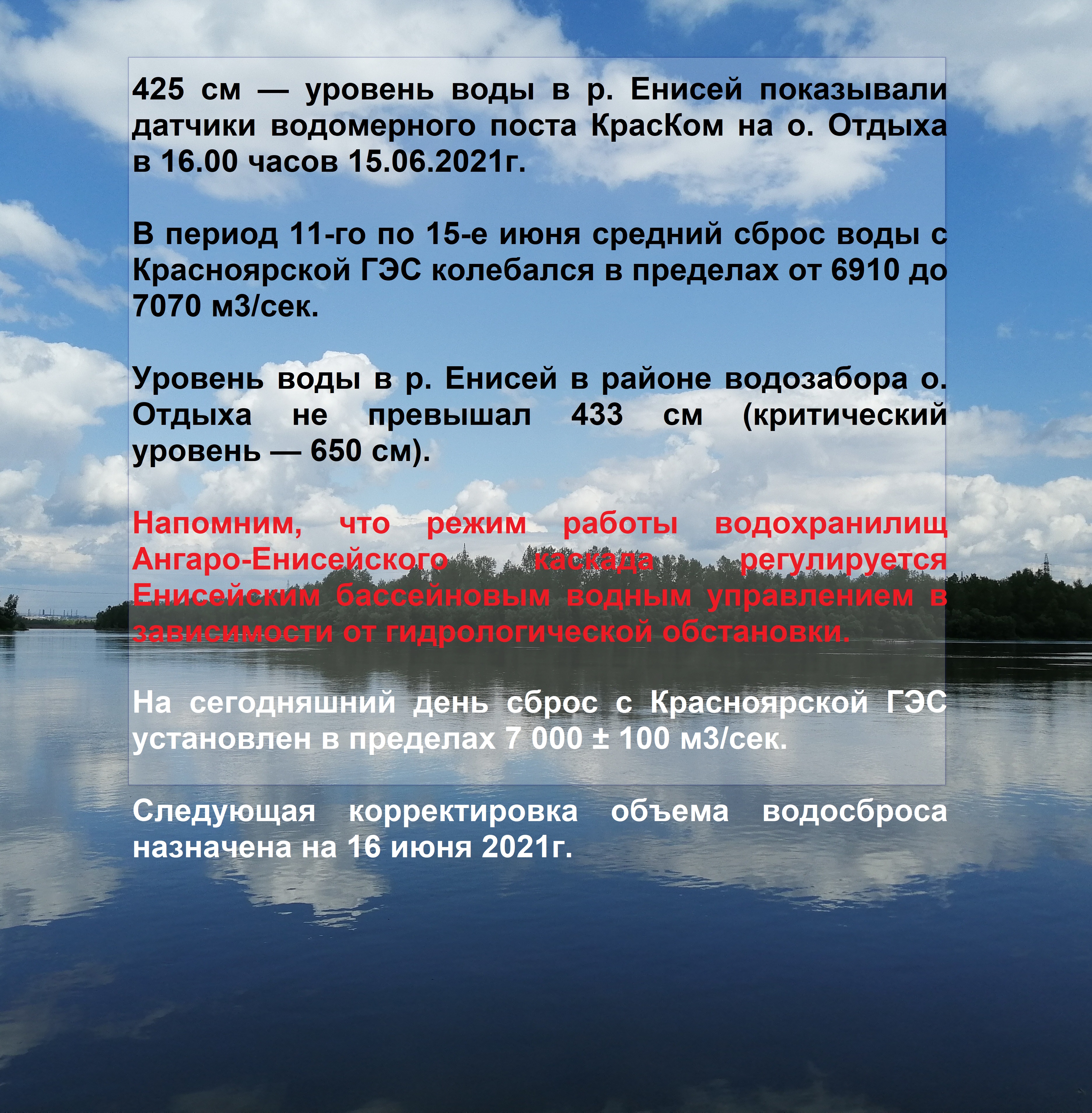 В период 11-го по 15-е июня средний сброс воды с Красноярской ГЭС колебался в пределах от 6910 до 7070 м3/сек.