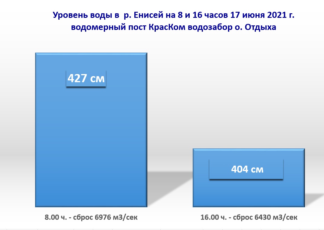 К 16.00 часам 17 июня 2021г уровень воды р. Енисей в районе водомерного поста КрасКом водозабора о. Отдыха снизился на 23 см и составляет 404 см.
