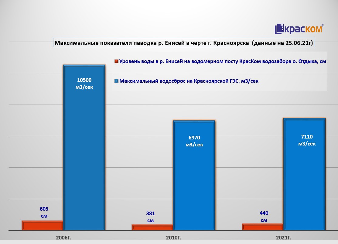 Для сравнения: максимальный уровень воды во время паводка 2010 года составлял 381 см 18-го июня, когда сброс воды на Красноярской ГЭС достигал 6970 м3/сек.