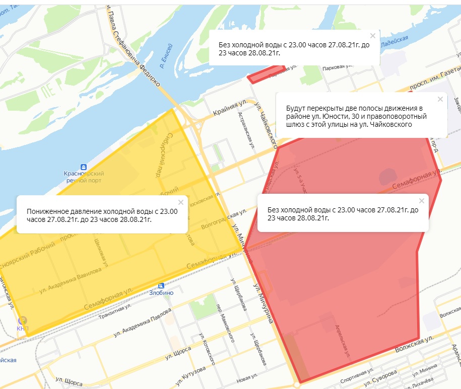 Также возможно пониженное давление холодной воды в границах улиц Мичурина-Затонская на участке между р. Енисей и Транссибирской железнодорожной магистралью.